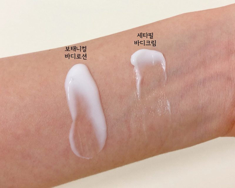 보태니컬 바디로션과 세타필 바디크림의 제형은 이정도의 차이가 납니다. 딱봐도 세타필은 꾸덕하고 보태니컬은 묽죠. 보태니컬은 워낙 묽은 제형이라 내용물이 의도보다 많이 나올때가 많아요. 그래도 워낙 가벼운 사용감이라 듬뿍듬뿍 발라도 부담감이 없어요. 반면 세타필은 꾸덕해서 잘 펴발라줘야 하는 불편함이 있지만 가성비 내리는 훌륭한 보습제라는 점에서 포기할 수 없는 제품이에요.
