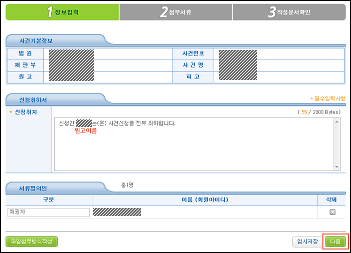 3. 다음 화면에 나오는 사건 정보가 정확한지 확인한 후 '확인' 버튼을 누르면 정보 입력 화면이 나옵니다. 이 화면에서 입력되어 있는 정보는 아무것도 건드리지 말고, 신청취지에 'OOO'로 표시되어있는 부분만 자신(채권자, 원고) 이름을 바꿔 넣습니다. 그런다음 다음 버튼을 누릅니다.