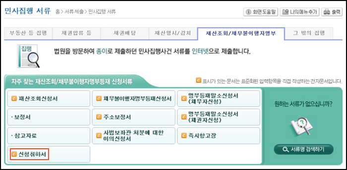 2. 재산조회 / 채무불이행자명부 탭을 선택하고, 신청취하서 메뉴를 클릭합니다.