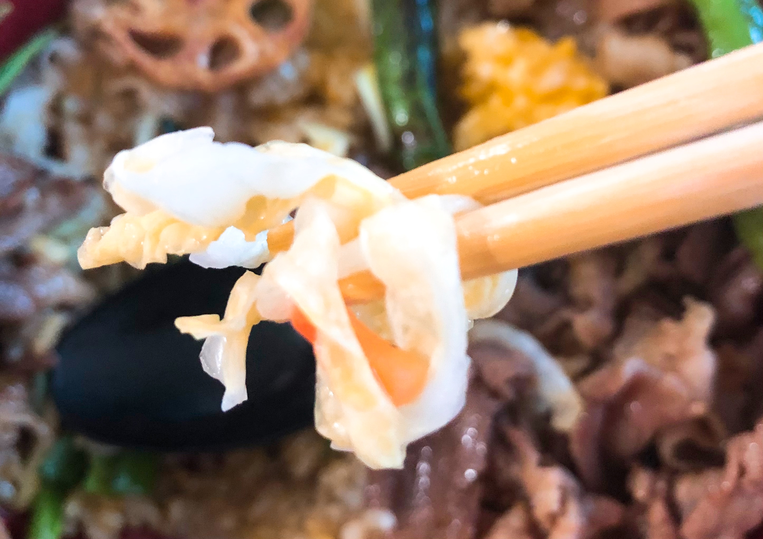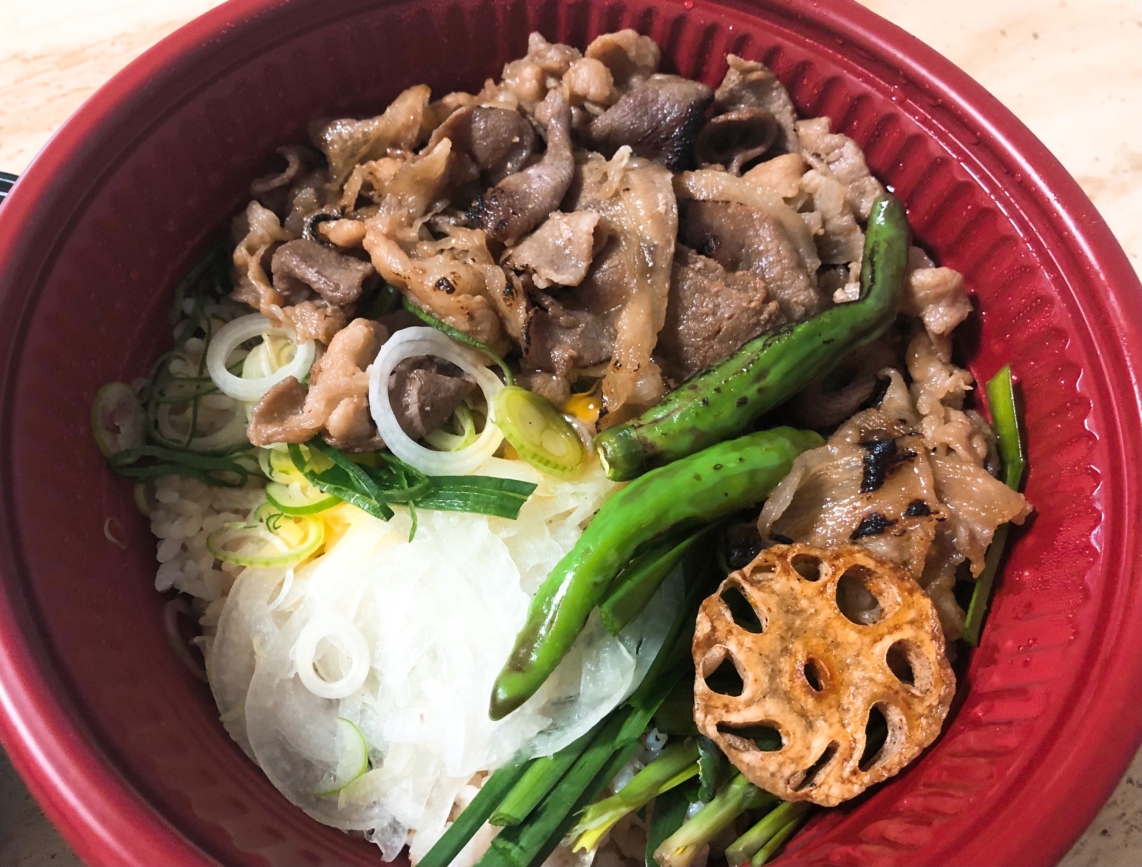 제가 주문한 건 장사장 부타동(\8,900)입니다:-) 덮밥 장사장에서 가장 기본이 되는 메뉴인 것 같아서 시켜봤어요. 고기양도 많고, 양파, 파, 부추에다 꽈리고추와 연근 튀김까지 올려져서 오더라구요.
