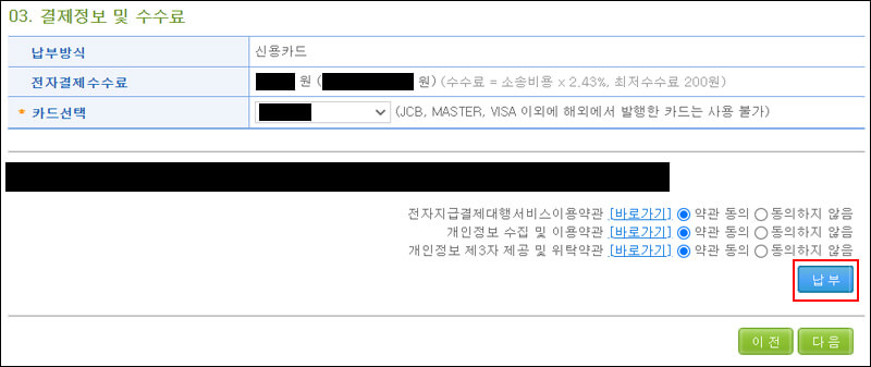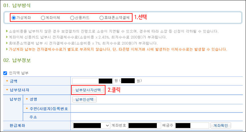 11-2. 아래로 내려가서 송달료도 인지대와 똑같은 방법으로 선택합니다. 그리고 환급계좌를 입력하고 내려와서 카드 혹은 납부 은행을 선택하고, '납부' 버튼을 클릭해서 납부합니다. 소송금액 납부는 크롬 등의 브라우저에선 진행이 안되더라구요. 납부가 진행이 안되면 우선 익스플로러에서 진행해보세요.