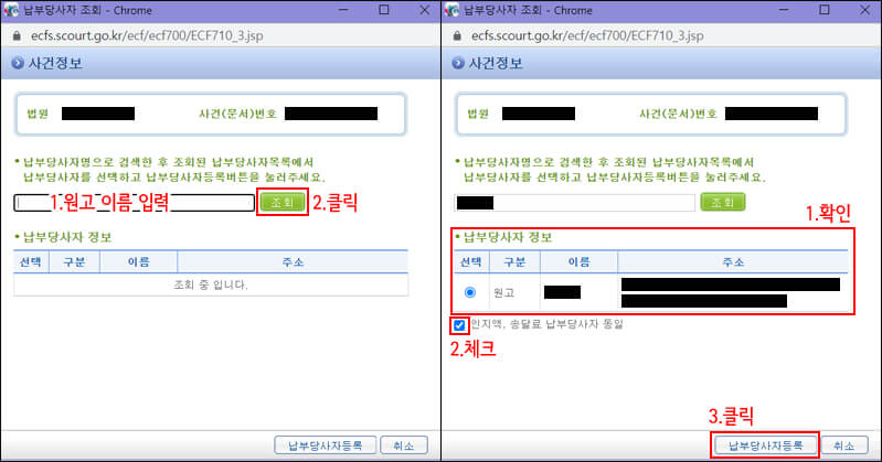 11-1. 그러면 '납부당사자 조회' 팝업이 뜨는데 이곳에 자신(원고)의 이름을 입력하고, 조회합니다. 자신의 인적사항이 맞는지 확인한 후, '납부당사자등록'을 클릭합니다.