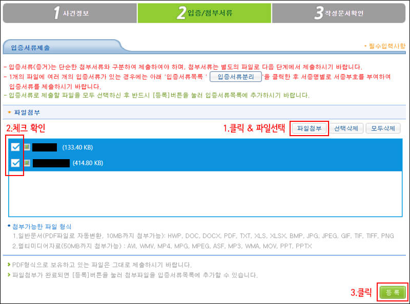 8. 다음은 입증/첨부서류 첨부할 순서입니다. 우선 준비한 증거 자료를 첨부합니다. '파일첨부' 버튼을 눌러 증거 파일을 선택한 후, '등록' 버튼을 눌러 등록합니다. 증거 파일은 문자 / 송장 / 거래내역서 등 증거별로 나눠 업로드하는 것이 더 편하니, 증거 파일 만들 때 참고하세요:-)