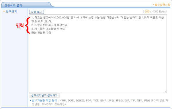 6. 청구취지를 입력합니다. 청구취지는 아래와 같이 입력하면 됩니다. 대부분의 경우, 아래와 똑같이 입력하시면 문제없이 진행됩니다.