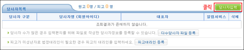 5. 당사자를 입력합니다. 당사자 입력은 우선 오른쪽의 '당사자입력'이라는 초록색 버튼을 클릭합니다.