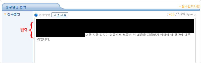 7. 다음으로 청구원인을 입력합니다. 청구원인은 피해가 일어난 날짜와 과정, 그리고 원고가 대금을 받기 위한 노력에 대해 간략하게 적으면 됩니다. '이러한 피해를 입었고, 이러한 노력을 했지만 피고의 의지 부족으로 청구하게 되었다.'는 내용이 되면 됩니다:-) 청구원인까지 입력을 다 했으면, '다음' 버튼을 눌러 다음으로 넘어갑니다.