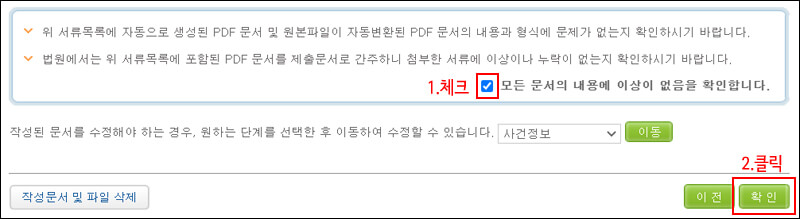 10. 그러면 '작성문서확인' 탭이 나옵니다. 작성한 서류에 오류는 없는지, 업로드한 입증 서류가 문제 없이 잘 업로드 되었는지 다시 한번 확인합니다. 그런 다음 아래로 내려서 '모든 문서에 이상이 없음을 확인합니다'에 체크하고, '확인'을 누릅니다.
