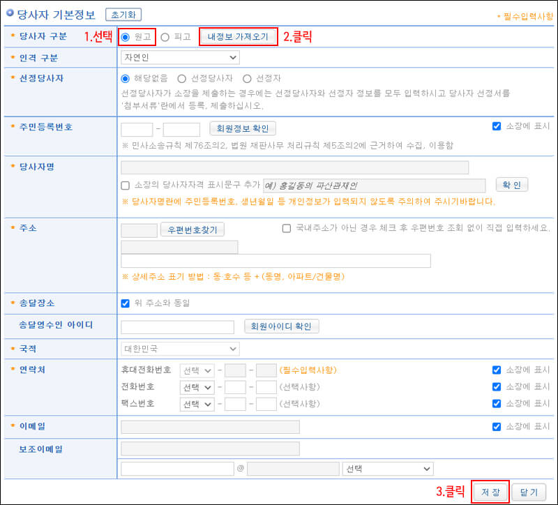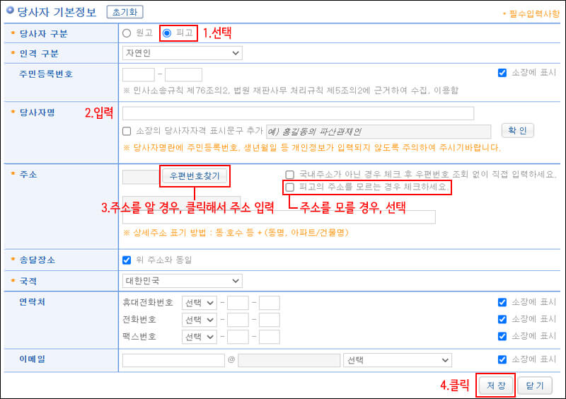 5-2. 다음으로 피고의 정보를 입력합니다. 당사자 구분 칸에서 '피고'를 선택하고, 알고 있는 정보를 모두 입력합니다. 이 단계에서 무조건 정확히 입력해야 하는 정보는 '당사자명' 뿐이고, 나머지 정보는 사실조회신청 단계를 통해 특정할 수 있으니 알고 있는 정보만 입력하면 됩니다. 정보를 모두 입력한 후, 다시 '저장'을 누릅니다.