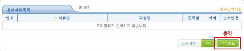9. 입증 서류 등록 후, 아래로 내려가면 첨부 서류 부분이 있습니다. 이 부분에선 상대방의 등본 등을 미리 떼 둔 경우, 업로드 하는 칸으로, 이곳에 증거를 업로드 하지 않도록 주의하셔야 합니다! 첨부할 서류가 없으면 '작성완료'를 클릭합니다.