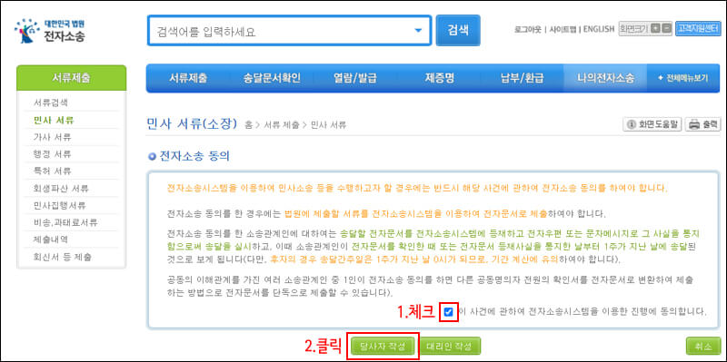 2. 그런 다음 전자소송 내용을 확인하시고, 동의합니다에 체크 후, '당사자 작성' 버튼을 클릭합니다. 소액심판의 경우, 법률 대리 자격이 없어도 직계 가족이 대리할 수 있지만 전자소송은 당사자만 가능하니 참고하시길 바랍니다:-)