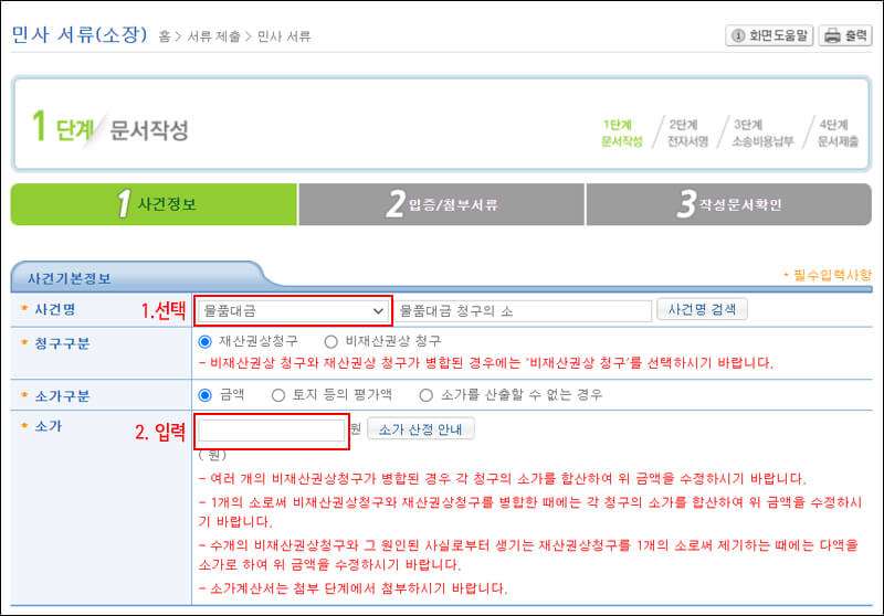 3. 사건명을 선택하고, 소가를 입력합니다. 사건은 각자 해당되는 사건을 선택하시면 되고, 소가는 피해 금액을 입력하면 됩니다.