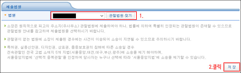 4. 그리고 관할법원을 선택합니다. 원칙적으로는 피고 주소지의 관할법원을 하는 것이 원칙이지만 소액심판은 원고의 관할법원에서도 진행이 되더라구요. 저는 지난 사건 모두 제 지역의 법원에서 문제없이 진행했었어요:-)