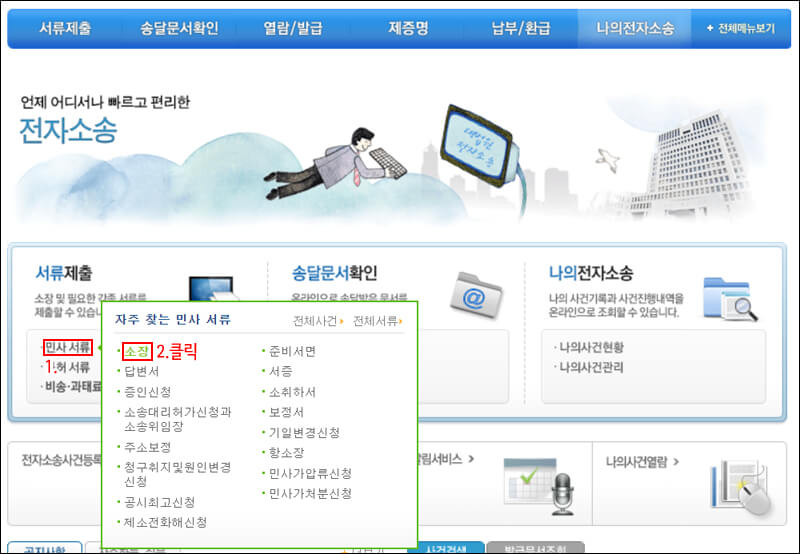 1. 우선 전자소송 사이트를 들어갑니다. 메인 화면에서 서류제출 > 민사 서류 > 소장을 클릭합니다.