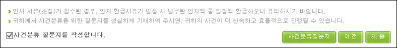 12. 납부까지 다 하고 나면 '사건분류 질문지'가 뜹니다. 저도 처음 보는 단계였는데, 질문지 작성하면 사건 진행이 빨라질 것 같아 작성하는 게 좋을 것 같더라구요. 질문지 작성 다하고, '제출' 버튼 누르면 끝입니다.