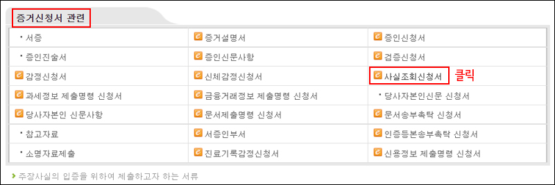 3-2. 그런 다음 밑으로 살짝 이동해서 '증거신청서 관련' 탭을 찾습니다. 그중 '사실조회신청서' 메뉴를 클릭합니다.