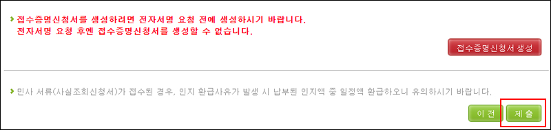 9. 마지막으로 '제출' 버튼을 누르고, 공인인증서로 전자서명을 하면 사실조회신청 완료입니다.