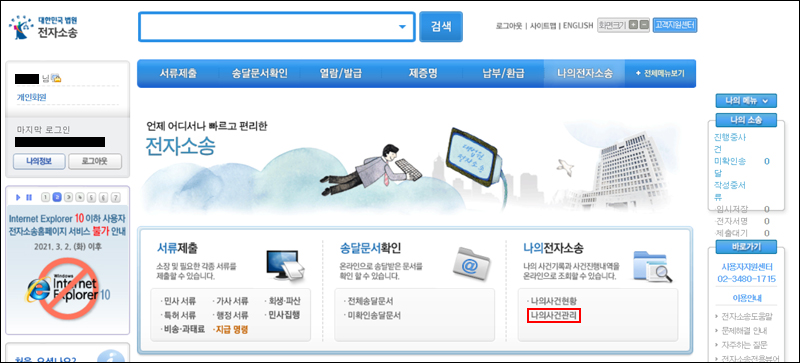 1. 전자소송 사이트 메인화면에서 '나의전자소송' 탭에서 '나의사건관리' 메뉴를 클릭합니다.