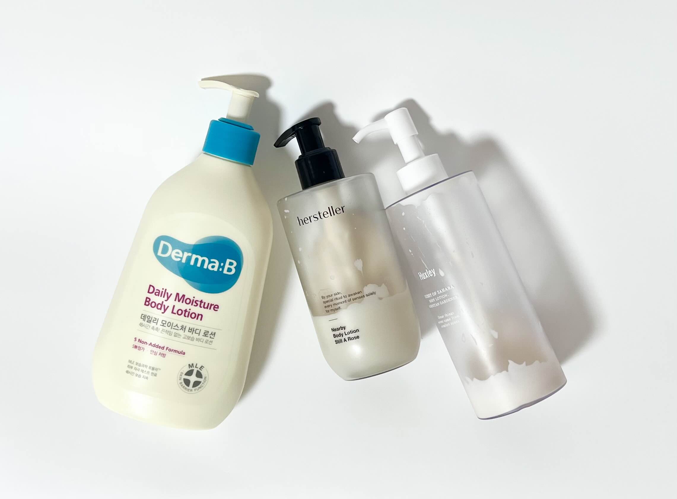 이번 여름, 잘 사용한 세 가지 바디로션, 더마비 데일리 모이스처 바디로션, 허스텔러 니어바이 바디로션, 헉슬리 바디로션 입니다:-) 바디 피부가 더 건조해져서 작년부턴 여름에도 보습에 신경 쓰고 있어서 올해엔 바디로션을 3가지나 구입해서 번갈아가면서 혹은 섞어서 사용했어요.