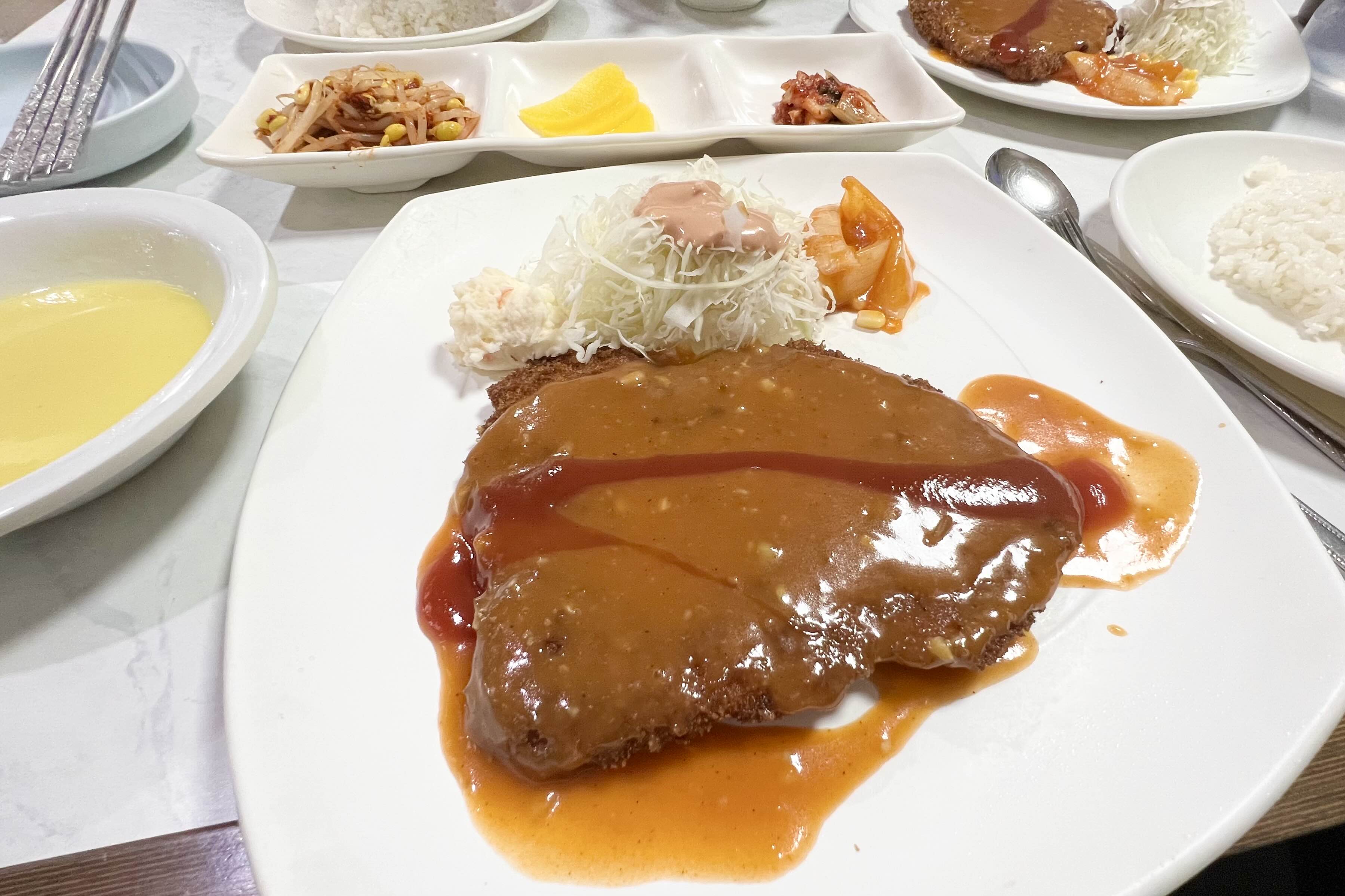 사진에는 한산해 보이는데 자리가 꽉 차서 좌식 자리에 앉아야 했어요. 뒤쪽으로도 자리가 더 있는지 손님들이 들락날락했어요. 옛날 경양식 돈가스 집이다 보니 손님 나잇대가 다양하더라구요. 옆자리 꼬마 손님이 너무 보채서 정신이 없었습니다...ㅋㅋㅋ... 그래서 원래도 잘 찍진 못하던 사진이 엄청 엉망이네요:-(