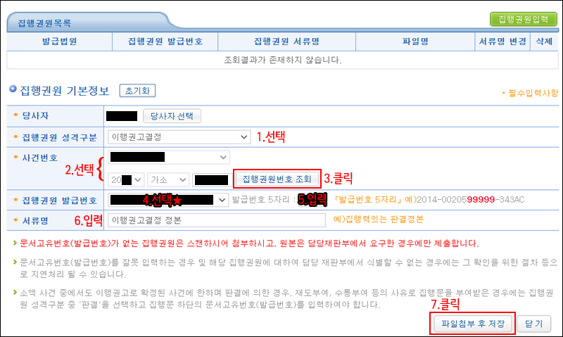 (5) '파일첨부 후 저장' 버튼을 누르고, 미리 스캔해 둔 판결정본이나 이행권고결정문 파일을 첨부합니다.