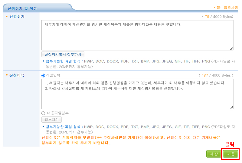 6. 신청취지 및 이유는 사전에 입력되어 있기 때문에 그대로 두고, '다음' 버튼을 클릭합니다.
