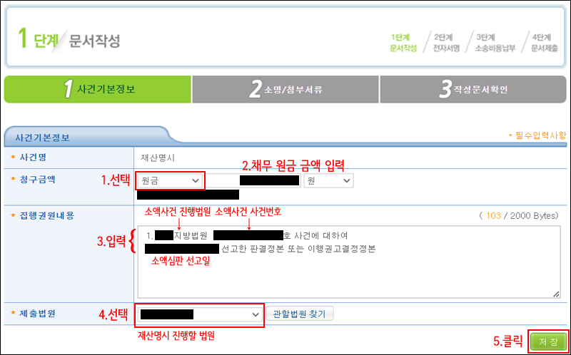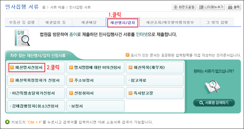 (3) 제출법원 : 재산명시부터 시작하는 채권추심 단계들은 모두 채무자 주소의 관할 법원에서 진행해야 합니다. 관할법원이 어딘지 모르겠다 하시는 분들은 '관할법원 찾기' 버튼을 눌러서 채무자 주소로 찾아보시면 됩니다:-)