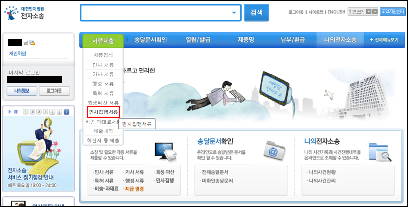 1. 전자소송 사이트에서 서류제출>민사집행서류 메뉴를 클릭합니다.