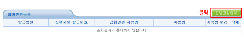 5. 다음으로 집행권원목록을 입력합니다. 집행권원은 내가 가지고 있는 소액심판의 판결정본, 이행권고결정정본 등을 지칭하는 말입니다:-) 먼저 오른쪽의 '집행권원입력' 버튼을 클릭합니다.